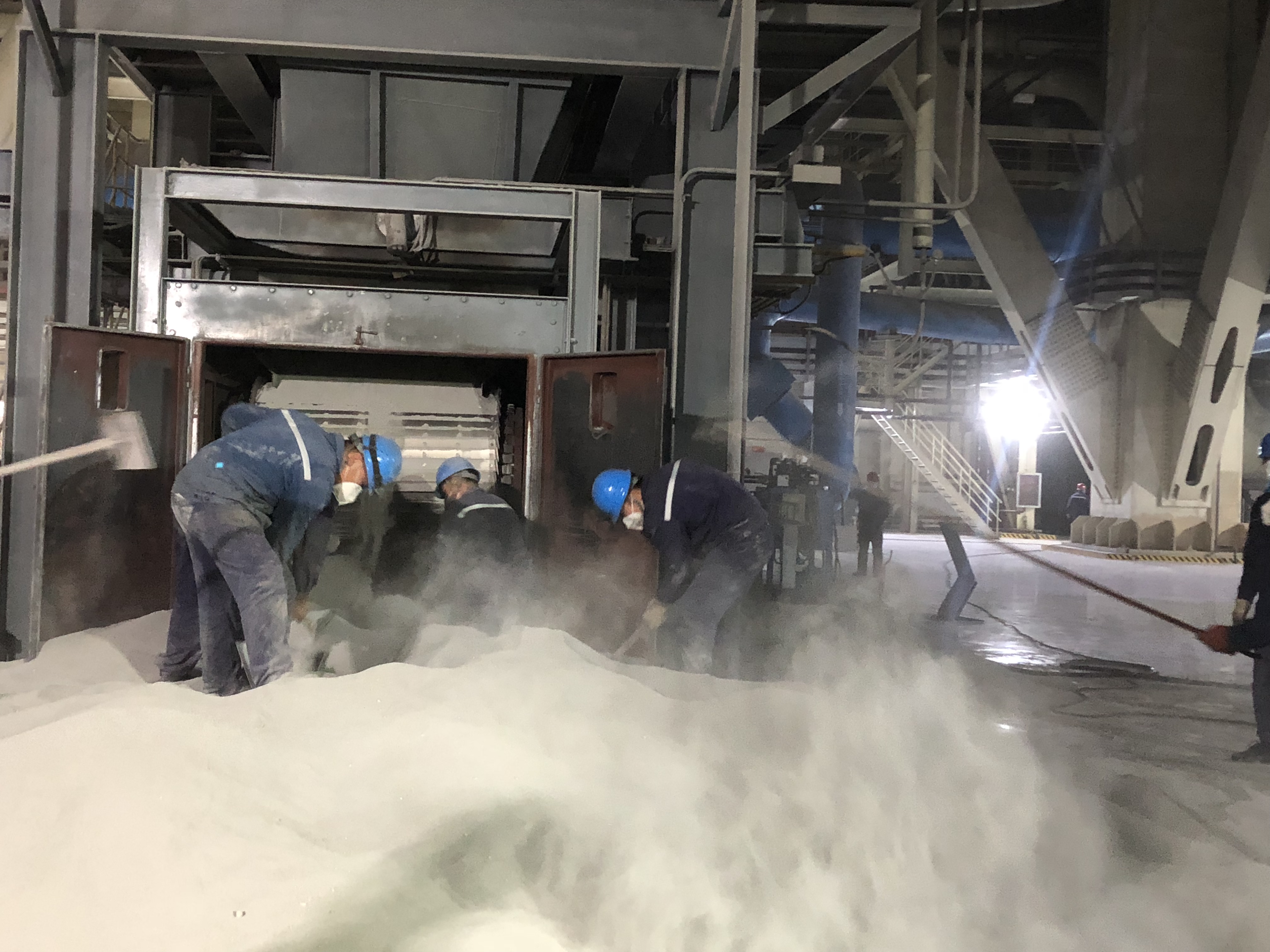 项目经理、总工组织坚守现场,紧盯节点,紧急协调项目部各专业人员全力投入抢修。脱落托辊共9只,而现场备品只有6只。汽化专业将废旧托辊可使用部分拆卸、拼装成11个托辊,作为紧急更换备件;炉燃专业根据#4炉干渣机观察孔尺寸,现场制作清灰刮板工具;电气专业借来胶皮管,用压缩空气清理钢带中的积灰;综合专业对变形的钢带进行加热、矫正;其余专业分区负责将灰渣往外清理。“兄弟齐心,其利断金”,虽然现场细灰飞扬,犹如浓雾笼罩,但大家心往一处想、劲往一处使,分工合作、全心投入,逐一对干渣机托辊、防跑偏轮进行检查更换。经过8个小时的连续奋战,共更换托辊17个。干渣机终于转起来了,喜悦在一张张积满灰尘的脸上还未散去,二级钢带过负荷跳闸,排渣系统再不排渣,就只能紧急停炉了。一级钢带、二级钢带清灰工作同时展开,所有管理人员全部投入抢修。这是一场争分夺秒的战役,一场只许胜不许败的战役。疲惫不堪的检修人员二话不说,即刻投入战斗,汗水和着灰尘变成一道道泥河在脸上流淌,一锨锨灰渣从观察孔、人孔……只要能出灰的地方,都在不间歇地输出着。