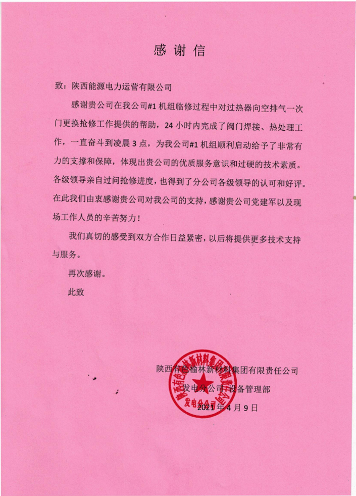 五一”刚过,公司收到陕西有色榆林新材料集团有限责任公司的表扬信。