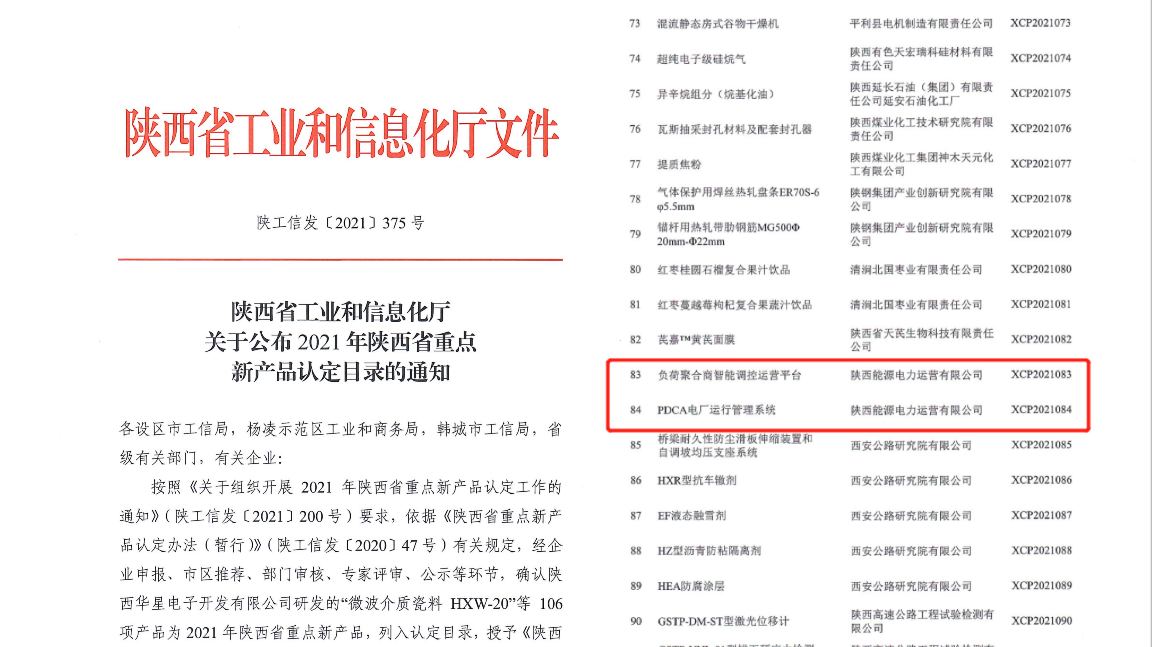 日前,陕西省工信厅公布了2021年陕西省重点新产品认定目录,公司《负荷聚合商智能调控运营平台》和《PDCA电厂运行管理系统》项目被列入陕西省重点新产品目录,并获取认定证书。入选项目经过前期的软件开发、科技查新、专家评审、科技成果认定等环节层层筛选,经专家组认定,达到了所在领域的国内领先水平。
