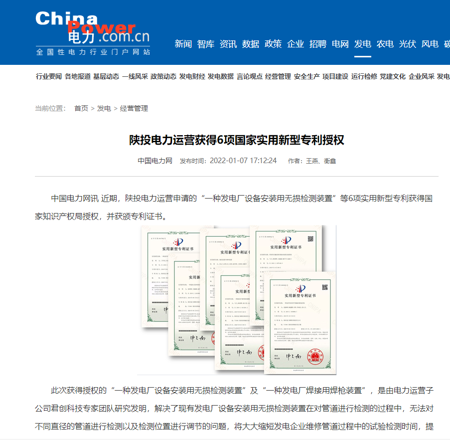 近期,陕投电力运营申请的“一种发电厂设备安装用无损检测装置”等6项实用新型专利获得国家知识产权局授权,并获颁专利证书。