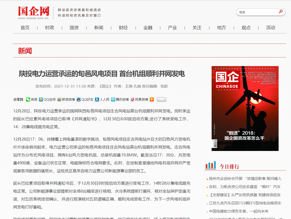 近日,公司承运的国网陕西旬邑风电项目庄合风电站、延长巴拉素风电首台机组相继并网发电。这是电力运营承接的首台和第二台风电项目,为公司深耕风力发电领域提供了经验和技术储备。