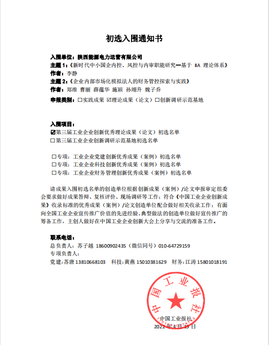 近期,公司《企业内部市场化模拟法人的财务管控探索与实践》与《新时代中小国企内控、内控与内审职能研究—基于IIA理论体系》两篇论文,成功入围中国工业报社第三届工业企业创新优秀理论成果(论文)初选名单。