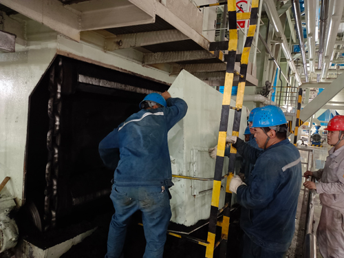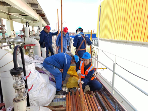 7月3日凌晨4点,1#炉捞渣机由于煤质原因和频繁吹灰跳闸,项目部负责人带领锅炉班全体人员进入现场清渣抢修,用铁锹奋力清除斜坡段余渣,紧握金属管快速破碎焦渣。捞渣机位于炉膛底部,现场十分闷热。虽然看不到汗珠滑落的场景,但大家的工作服全都湿透了,却没有人多说一句抱怨的话。