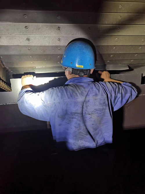 白天除了要完成检修准备工作,还要清理堆积如山的积渣积灰。因煤质原因,每隔2小时就要用3米多长的管子伸进炉膛打焦。炉膛的高温不一会儿就会将管子前端烧得通红。时值三伏时节,现场闷热难耐、粉尘飞扬,汗水混着粉尘在脸上流淌。积渣积灰清扫工作是对检修人员体力和耐力的严峻考验。#1钢带距离地面只有50多公分高,只能蜷缩身体钻进去,蚂蚁搬家似的一点点掏出积渣积灰。大家心往一处想、劲往一处使,只想着让干渣机尽早正常运转。