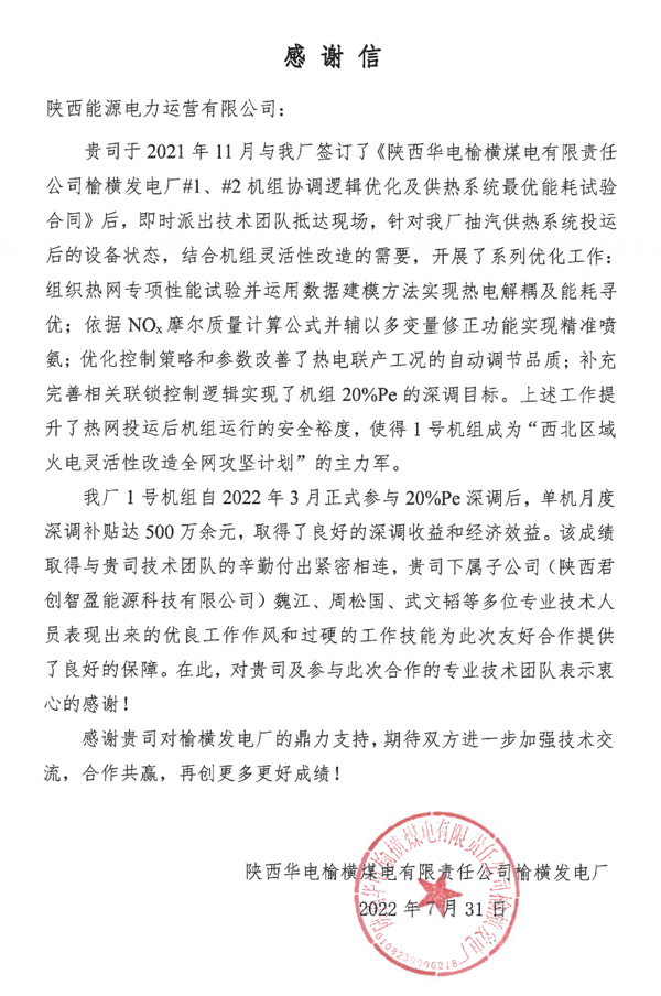 日前,君创科技顺利完成华电集团榆横煤电公司#1、#2机组协调逻辑优化及供热系统最优能耗试验,使业主机组成为“西北区域火电灵活性改造全网攻坚计划”的主力军。