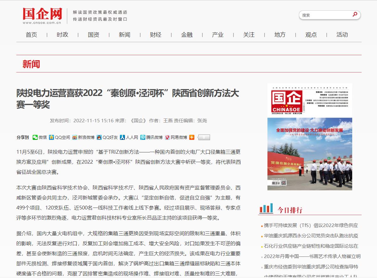 国企网:陕投电力运营喜获2022“秦创原•泾河杯”陕西省创新方法大赛一等奖