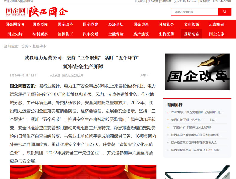 据行业统计,电力生产安全事故80%以上来自检维修作业。电力运营承担了系统内外7个电厂的检维修和光伏、风力、光热等运维业务,作业地域分散、生产环境迥异,外委队伍较多,安全风险随之叠加放大。2022年,电力运营全面落实疫情要防住、经济要稳住、发展要安全指示,坚持“三个聚焦”、紧盯“五个环节”,推进安全生产由被动接受监管向自我主动加压转变、安全风险管控由安管部门推动向班组自主开展转变、隐患排查治理由定期安检向日常生产自查自纠转变,与各业主单位携手完成能源保供任务,16项集团内外等检项目圆满收官,累计实现安全生产1827天,获荣获“省级安全文化示范企业”、陕投集团“2022年度安全生产先进企业”,并受邀参加第六届丝博会应急与安全展。
