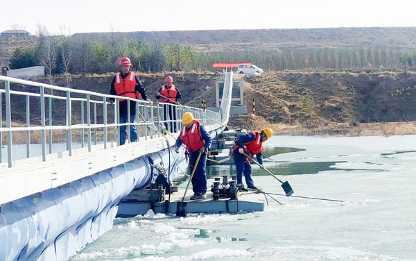 受气温回升影响,赵石畔煤电水源地王圪堵水库冰面融化加速,大块浮冰撞击输水管线浮箱,对取水泵船和输水管线造成威胁。赵石畔项目部第一时间抽调人员组织清理疏通冰凌,经过9小时不懈努力,上游约2500平米的冰块全部破碎,彻底疏通输水管线,有效保证了取水泵船的安全。