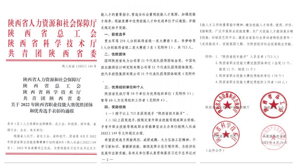 日前,陕西省人力资源和社会保障厅、陕西省总工会、陕西省科学技术厅以及共青团陕西省委,对2022年陕西省职业技能大赛优胜团体和优秀选手进行通报表彰,公司马鹏飞、许宏伟、王振华、杨健、雷震等5名参赛选手被授予“陕西省技术能手”荣誉称号。