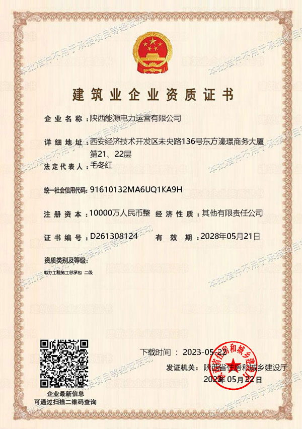 5月22日,经陕西省住房和城乡建设厅审批,公司顺利取得电力工程施工总承包二级资质,为承揽单机容量20万千瓦以下发电工程、220千伏以下送电线路和相同电压等级的变电站工程的施工业务赢得“入场券”,对公司“一体两翼双平台”发展战略布局具有重要意义。