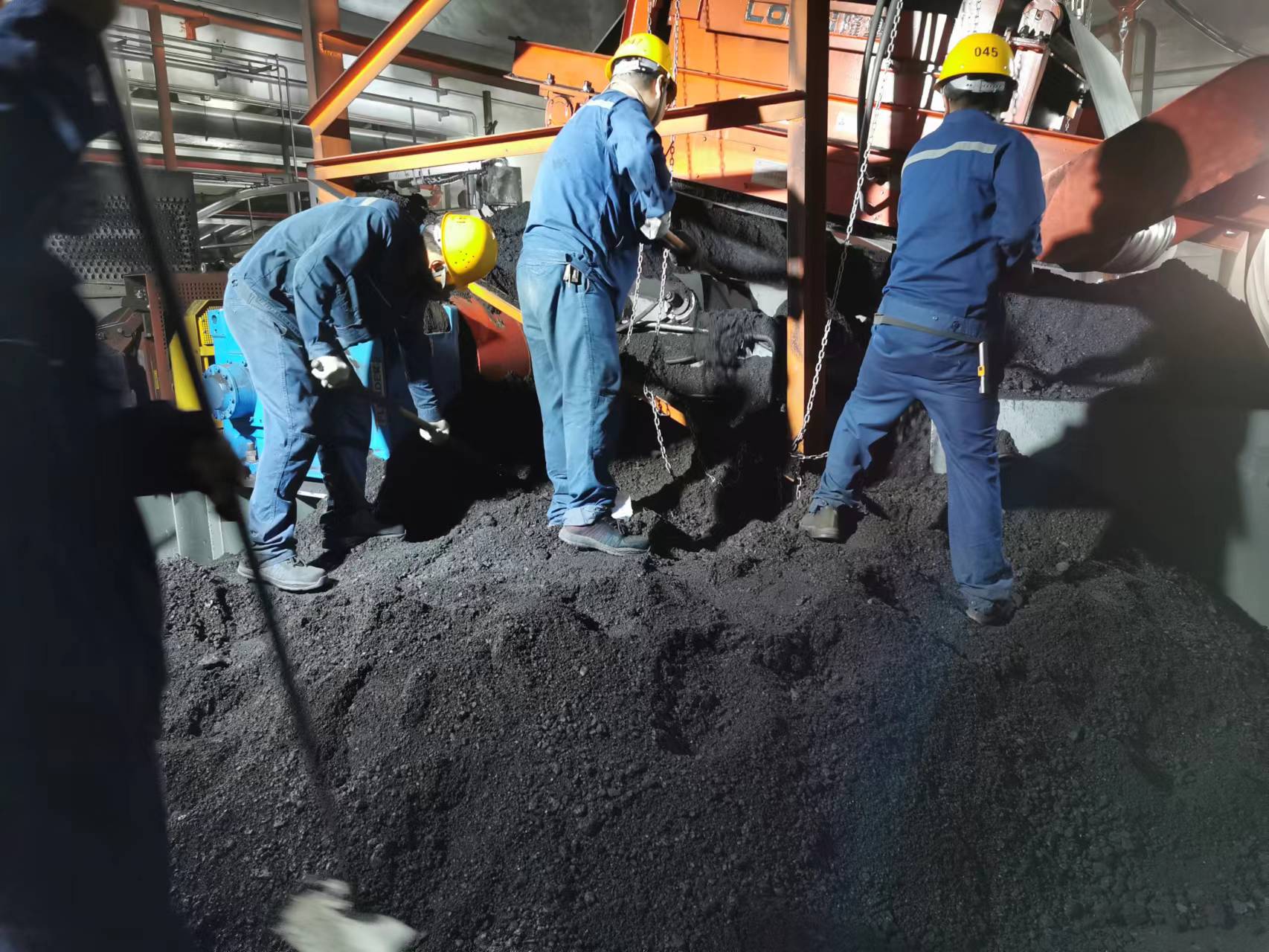 时间紧、任务急,在积煤最严重的#7带拉紧小室,所有队员面对堆积如小山的湿煤,齐心协力、配合默契,挥动着锹镐,争分夺秒装运积煤。有的积煤虽然没那么湿,粘性却很大,一锹下去根本铲不动,只能分割成“豆腐块”逐一处理,最难对付的还是堆积在设备下部的积煤,大家直不起腰、发不上力,清理起来极为困难,只能用最原始的方式一锹一锹清理。30多度高温使得运行车间内愈加闷热,不一会儿人人大汗淋漓、手上磨起水泡,汗水浸透工衣,“煤山”也以肉眼可见的速度逐渐变小。经过40小时的连续奋战,输煤系统恢复正常运行。