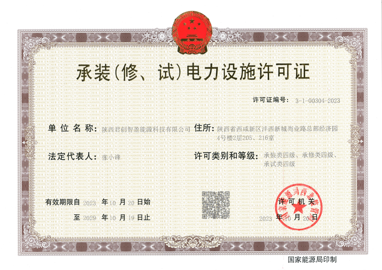 近日,经国家能源局西北监管局审核批准,君创科技成功获得“承装(修、试)电力设施许可证”资质。