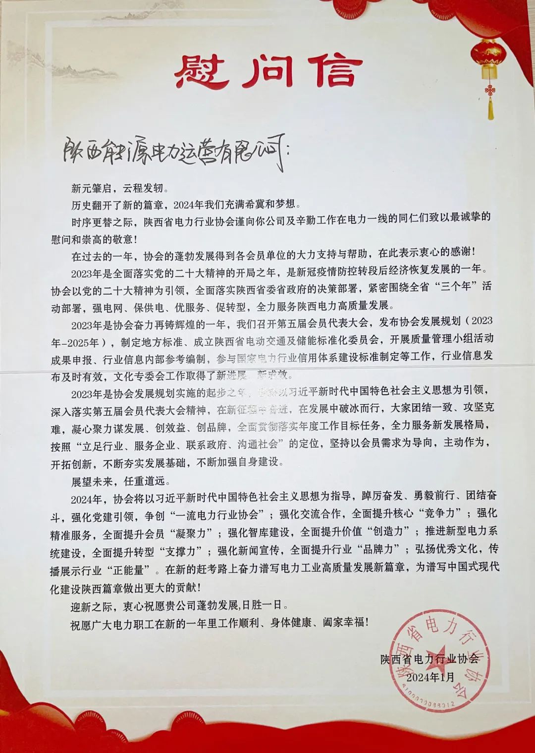 近日,公司收到陕西省电力行业协会发来的慰问信,对公司及辛勤工作在电力生产一线的同仁们致以诚挚慰问,对公司在2023年度大力支持协会各项业务工作,积极参与协会重要活动,有效助推协会行稳致远、高质量发展表示衷心感谢。