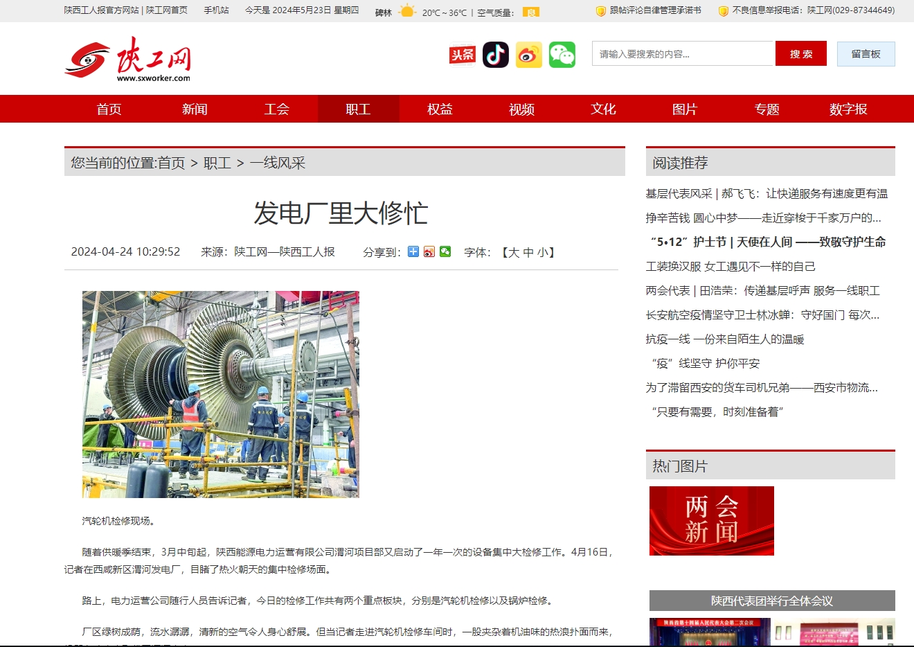 厂区绿树成荫,流水潺潺,清新的空气令人身心舒展。但当记者走进汽轮机检修车间时,一股夹杂着机油味的热浪扑面而来,机器轰鸣声也取代了潺潺水声。