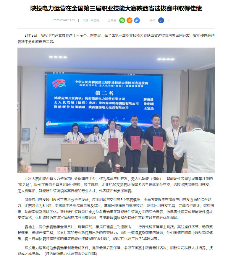 5月15日,陕投电力运营参赛选手王宝圣、解雨晨,在全国第三届职业技能大赛陕西省选拔赛鸿蒙应用开发、智能硬件装调赛项中分别取得第二名。