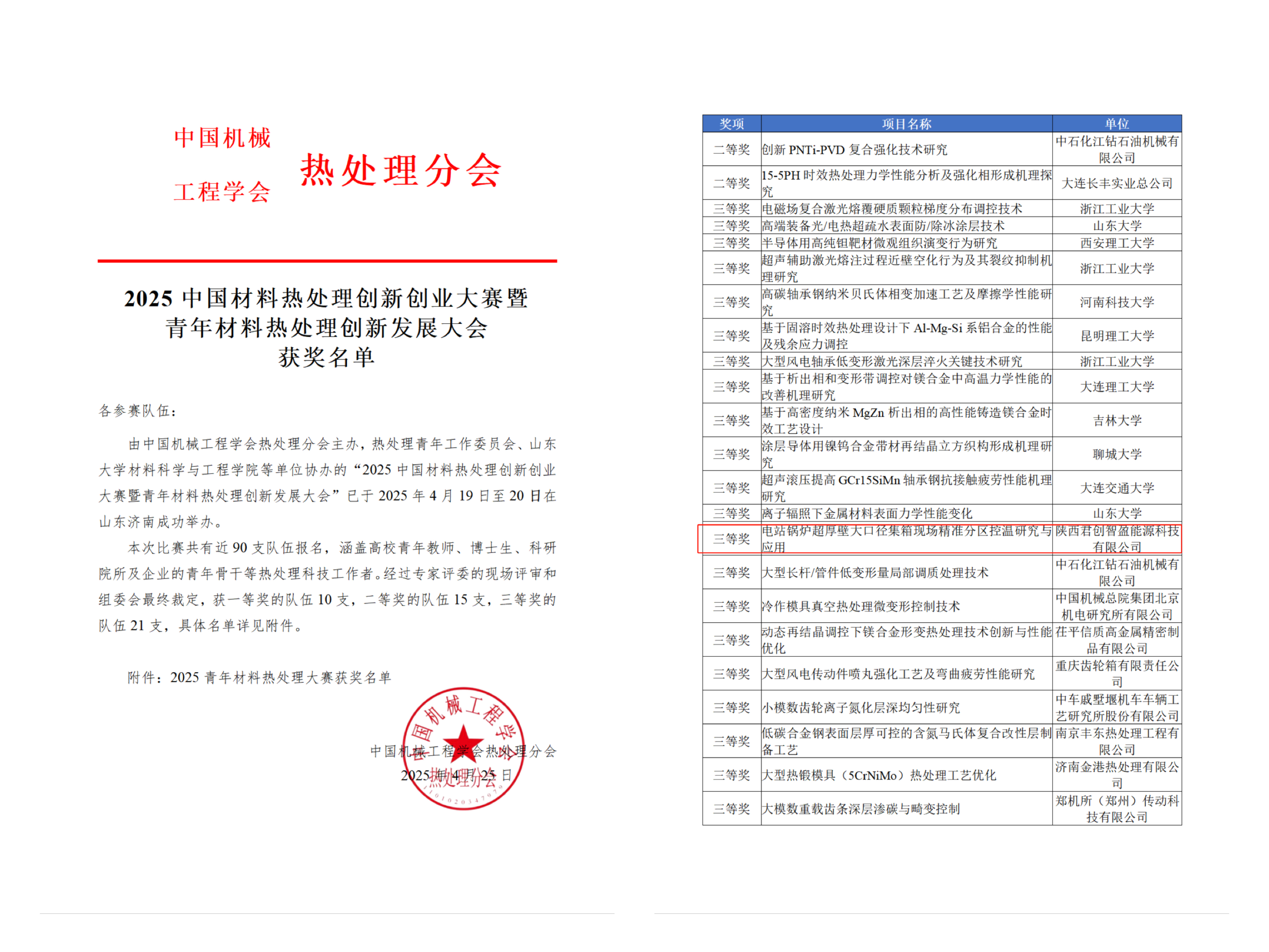 近日,君创科技《电站锅炉超厚壁大口径集箱现场精准分区控温研究与应用》荣获2025中国材料热处理创新创业大赛暨青年材料热处理创新发展大会中荣获三等奖。