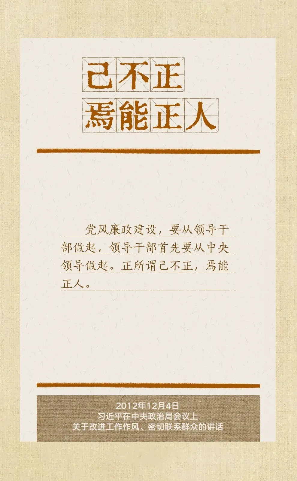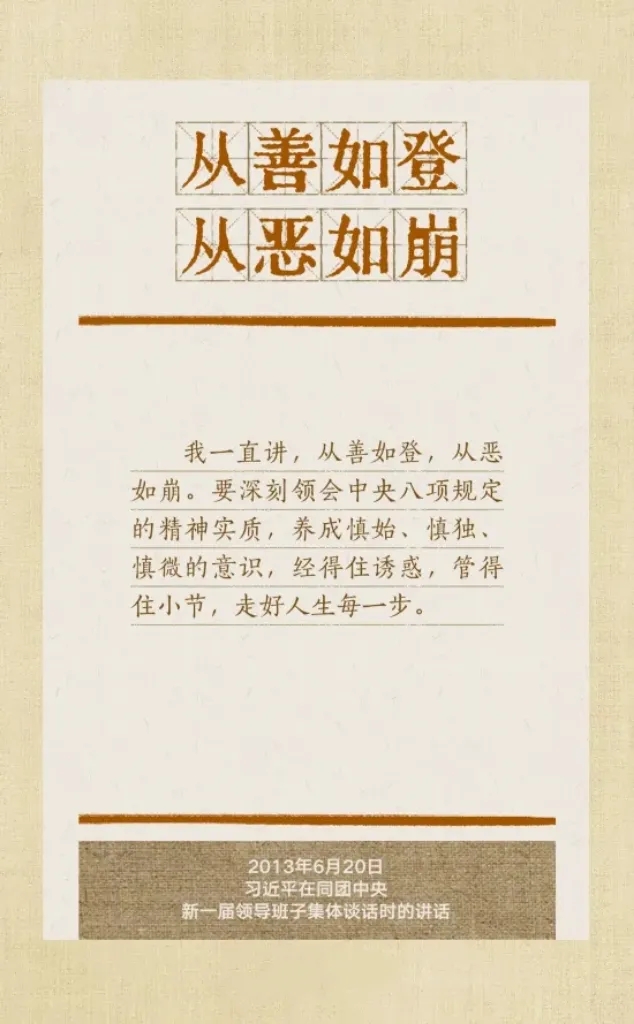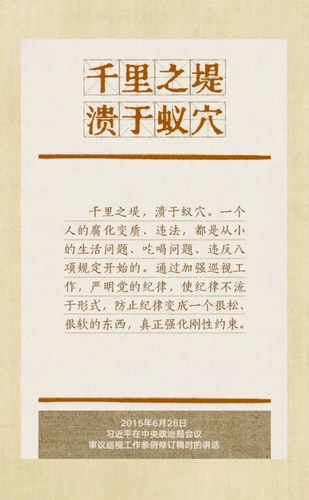 党的十八大以来,习近平总书记多次就抓好党的作风建设、贯彻落实中央八项规定精神发表重要讲话,作出重要批示,提出明确要求。“没有规矩,不成方圆”、“己不正,焉能正人”、“尽小者大,慎微者著”······总书记引用的这些古语耐人寻味。
