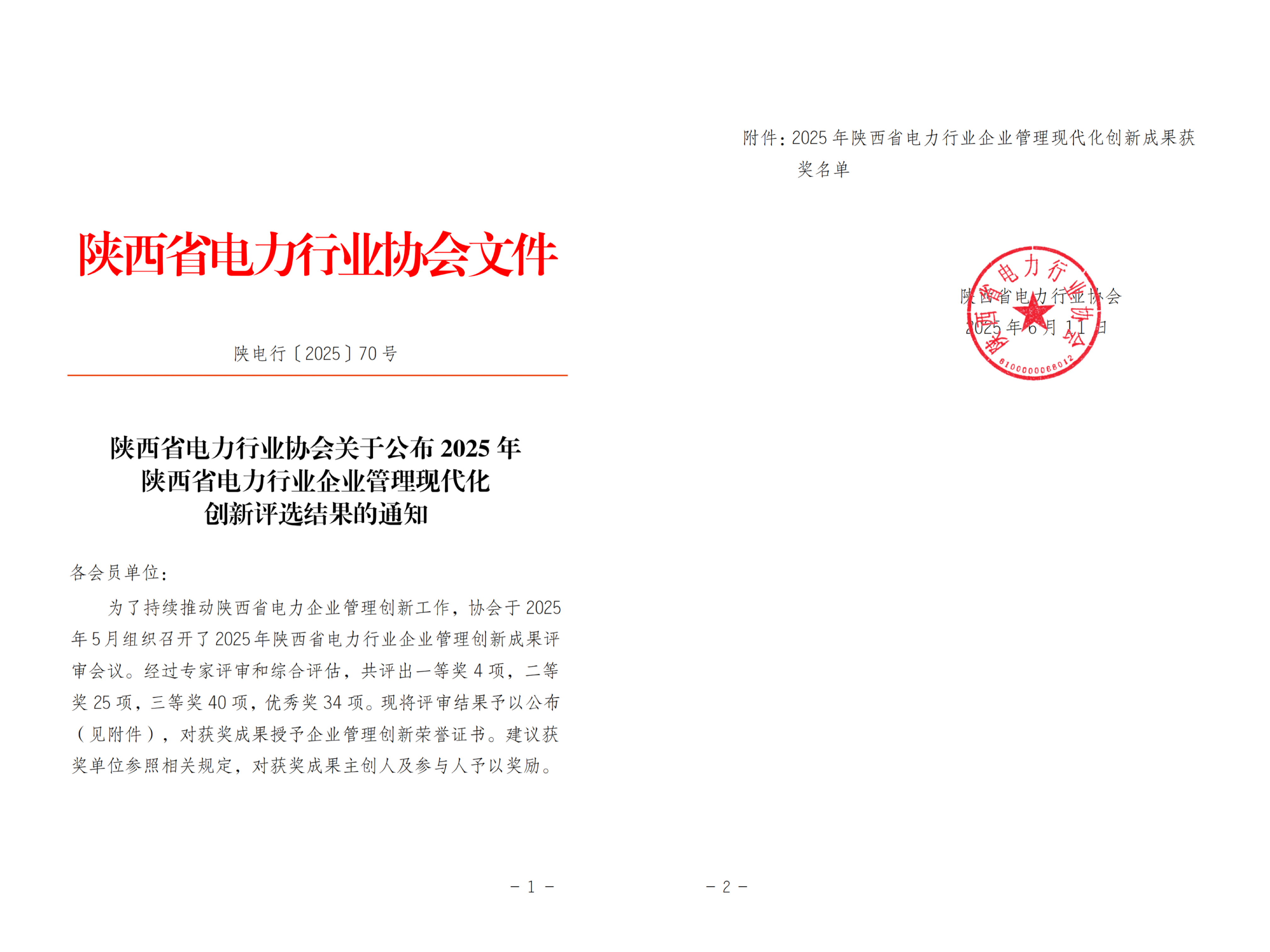 日前,陕西省电力行业协会公布2025年企业管理现代化创新评选结果,公司《电力检修企业高技能人才培养路径研究与实践》获三等奖,《基于AI大模型的电力检修企业“战略+业务”数智化转型管理创新实践》等4项成果获优秀奖。