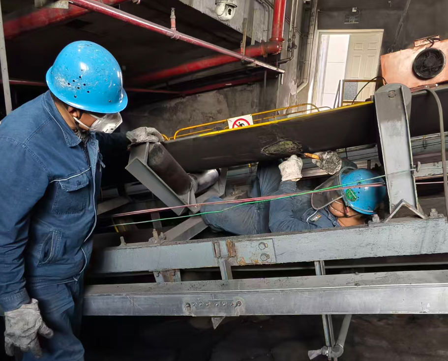 在不足半米高的皮带输送架下,输煤检修班张保亮半躺在地,蜷缩身体,在弥漫的粉尘中仔细排查每一个连接点和磨损处。他目光如炬,紧盯着每个细节,这个看似“躺平”的姿势,恰恰是为了让这条生产的“咽喉”要道能够稳稳地顺畅运行。