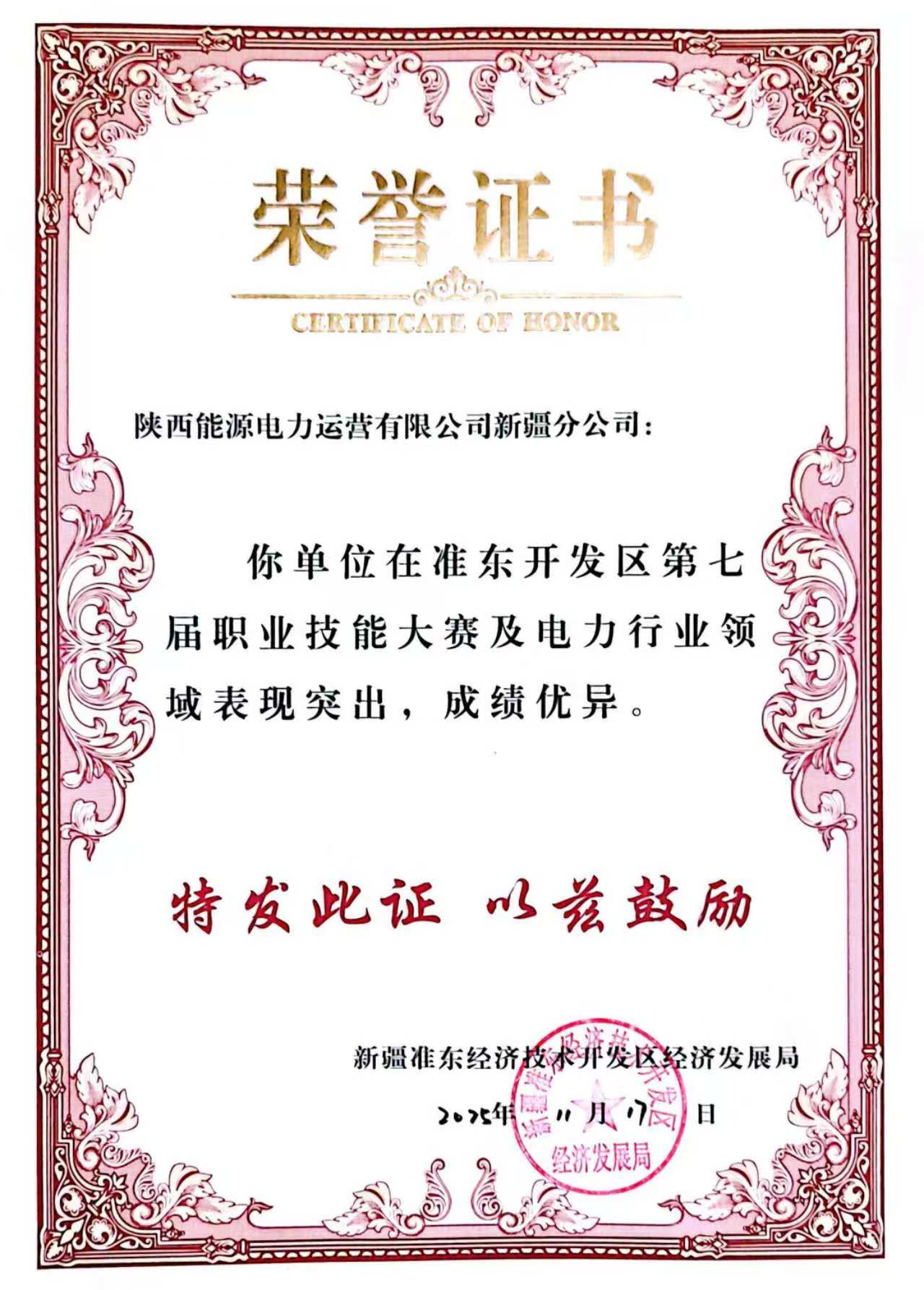 11月17日,新疆准东经济技术开发区经济发展局发布《关于表彰第七届职业技能大赛及电力行业领域突出表现单位与个人的通报》,对新疆分公司及三名优秀员工予以通报表扬,并颁发荣誉证书。