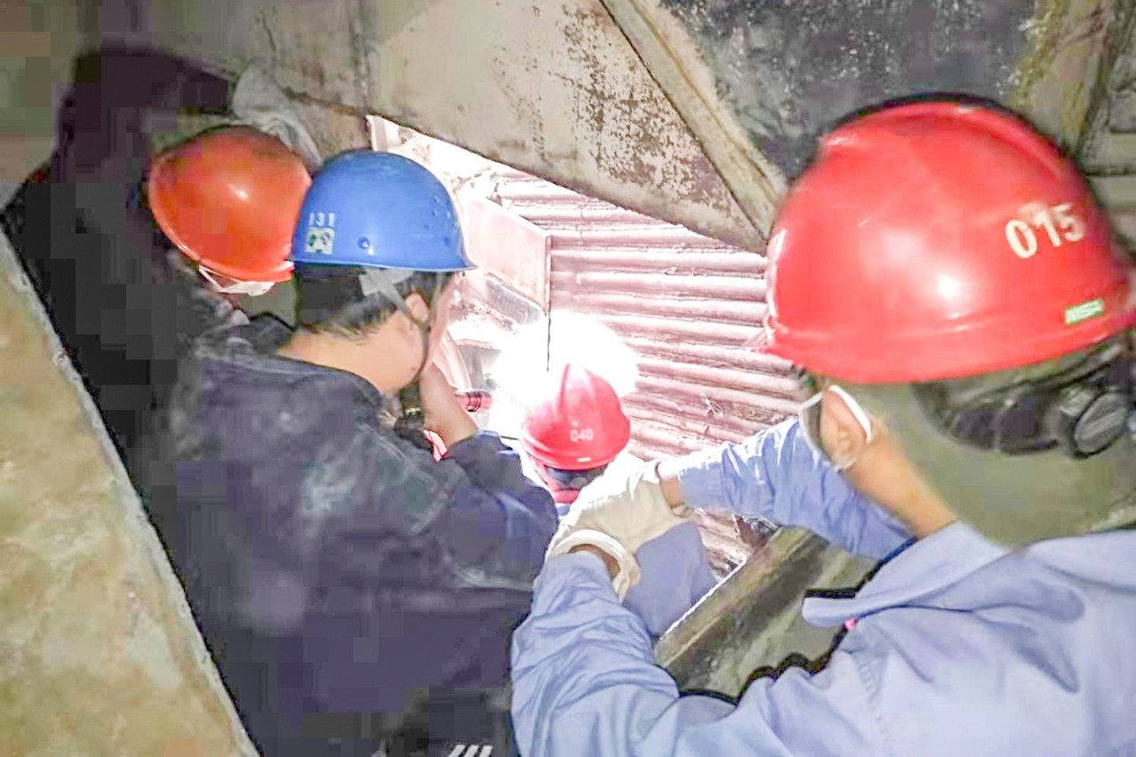 近日,商电#2机组停运后,锅炉班人员检查发现炉水冷壁管道标高20米处有一砂眼,但由于炉膛外管道错综复杂,作业地点又处于风箱内部,给检修工作带来极大的困难。工作人员在割掉2块钢板,穿过层层障碍,到达工作面后,又发现水冷壁管外还有三块限位钢板挡在面前。最终,排除重重“拦路虎”后,工作人员内外配合,经过一天紧张的割管、制口和焊管工作,圆满完成此项任务。