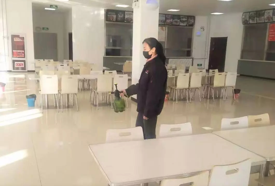2月10日8:45,我正在给员工餐厅消毒。——赵石畔项目部综合班程春丽