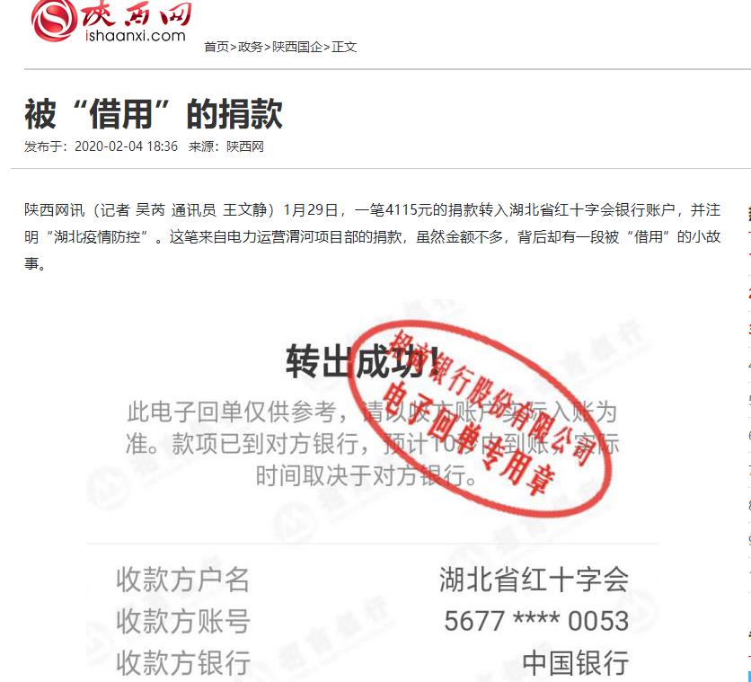 1月29日,一笔4115元的捐款转入湖北省红十字会银行账户,并注明“湖北疫情防控”。这笔来自电力运营渭河项目部的捐款,虽然金额不多,背后却有一段被“借用”的小故事。