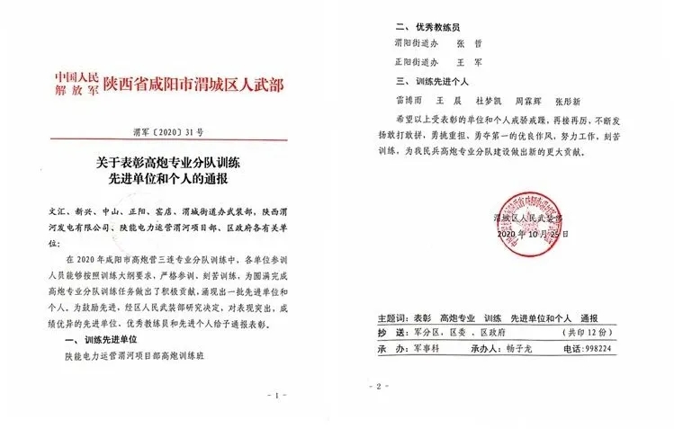 10月25日,在结训总结表彰大会上,国防动员单位领导对渭河项目部参训人员的表现给予充分肯定,对他们雷厉风行的作风和顽强拼搏的精神给予高度赞扬。“陕能电力运营渭河项目部高炮训练班”被咸阳市渭城区人民武装部评为“年度训练先进单位”,张彤新同志被评为“年度训练先进个人”,并予以通报表彰,为公司赢得了荣誉。